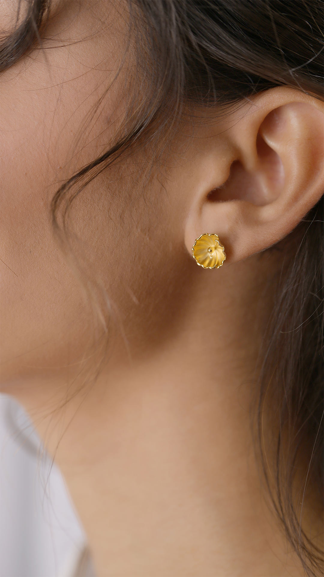 The Botanica Nature-Inspired Earrings in 14-carat solid gold feature delicately crafted flowers with etched centres, capturing nature’s elegance in timeless style.